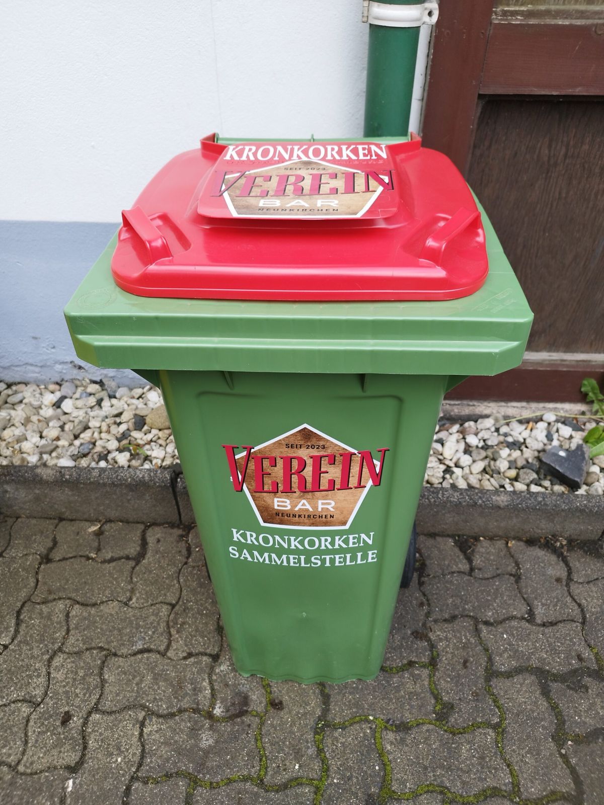 Jeder kann seine Kronkorken vorbeibringen und in die Sammeltonne werfen. Diese findet ihr, wenn ihr rechts neben dem Eingang der VereinBAR die Einfahrt hoch und dann links geht.